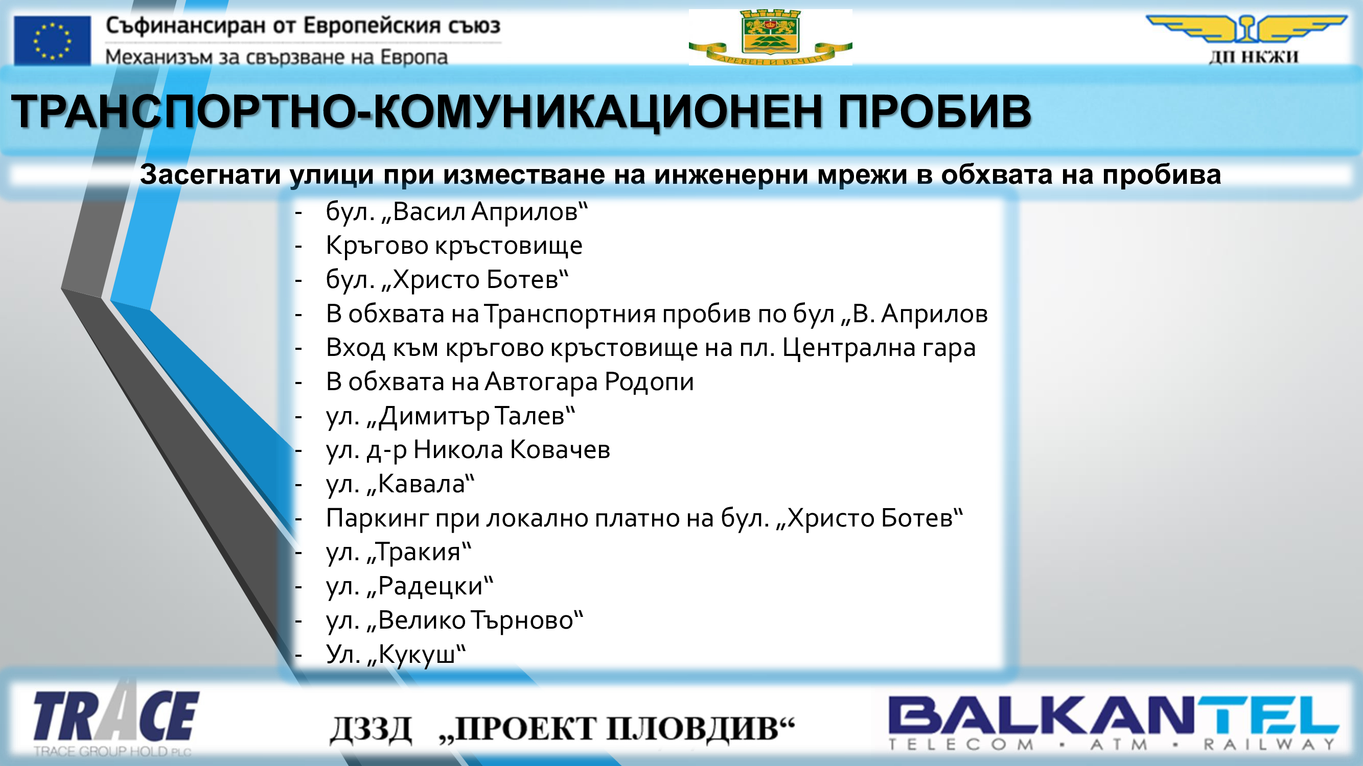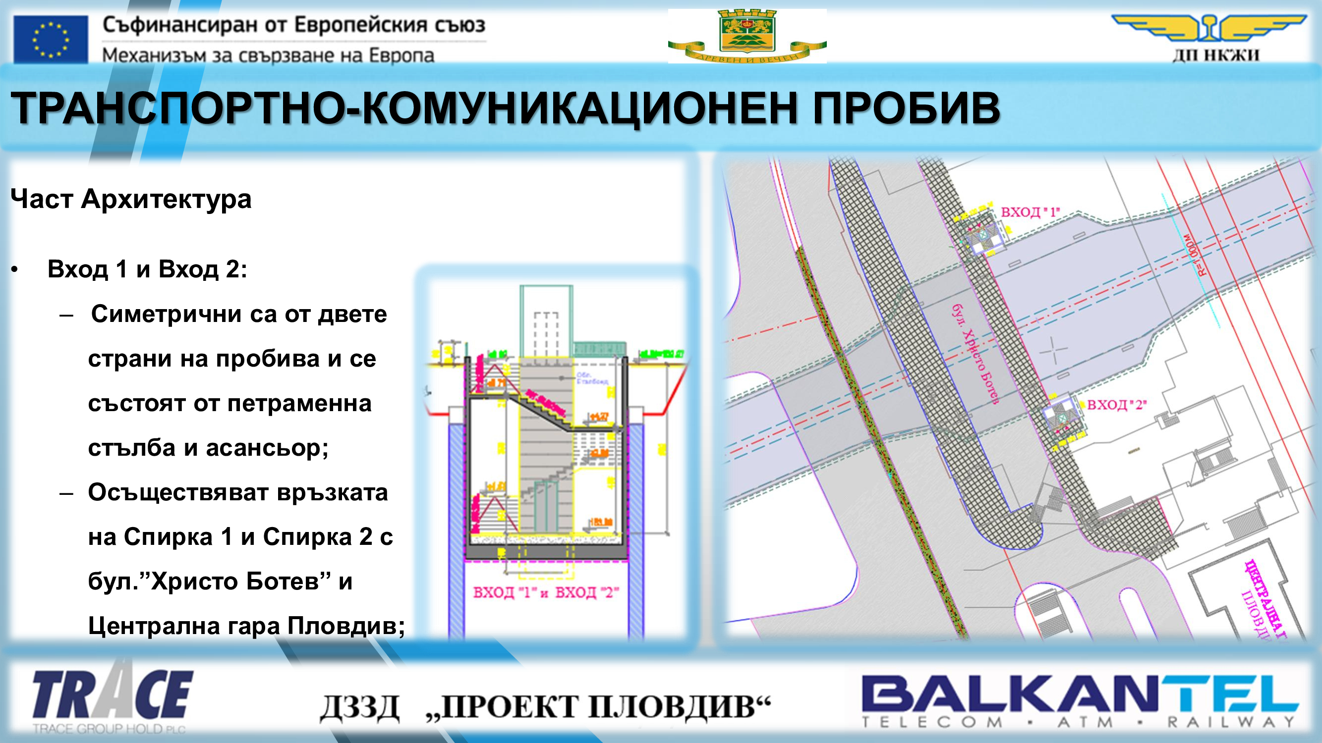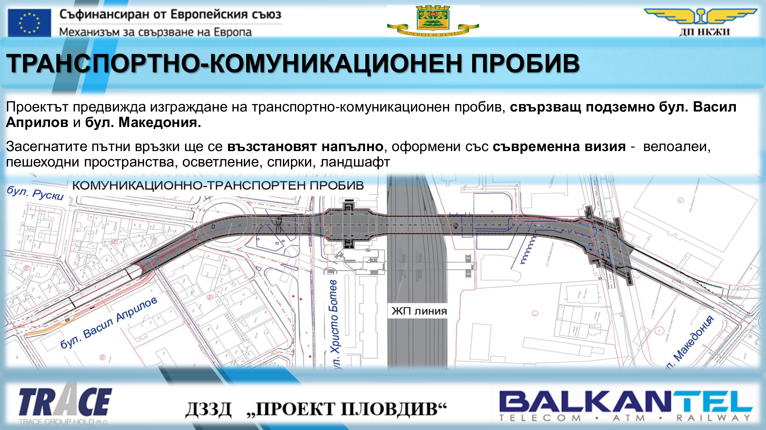 Обект „Модернизация на железен път, контактна мрежа и системи за сигнализация и телекомуникации в гара Пловдив и изграждане на комуникационно-транспортен пробив под жп ареала на гара Пловдив“ е част от проект „Развитие на железопътен възел Пловдив“ и се съфинансира със средства по Механизма за свързване на Европа (МСЕ).